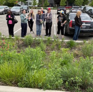 Program participants explore a rain garden installation at Belleville Area District Library in a program collaboratively offered with the Metroparks.